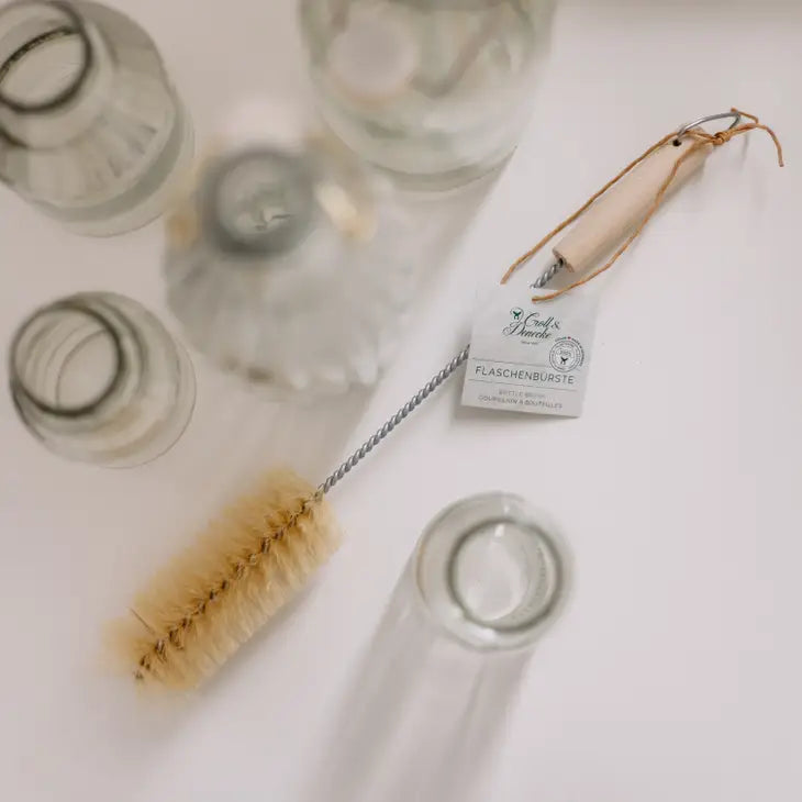 Our bottle brush consists of a metal wire, twisted sisal bristles and a handy handle made of FSC beech wood. There is also a metal hook at the end of the handle to hang the brush for drying and storage.